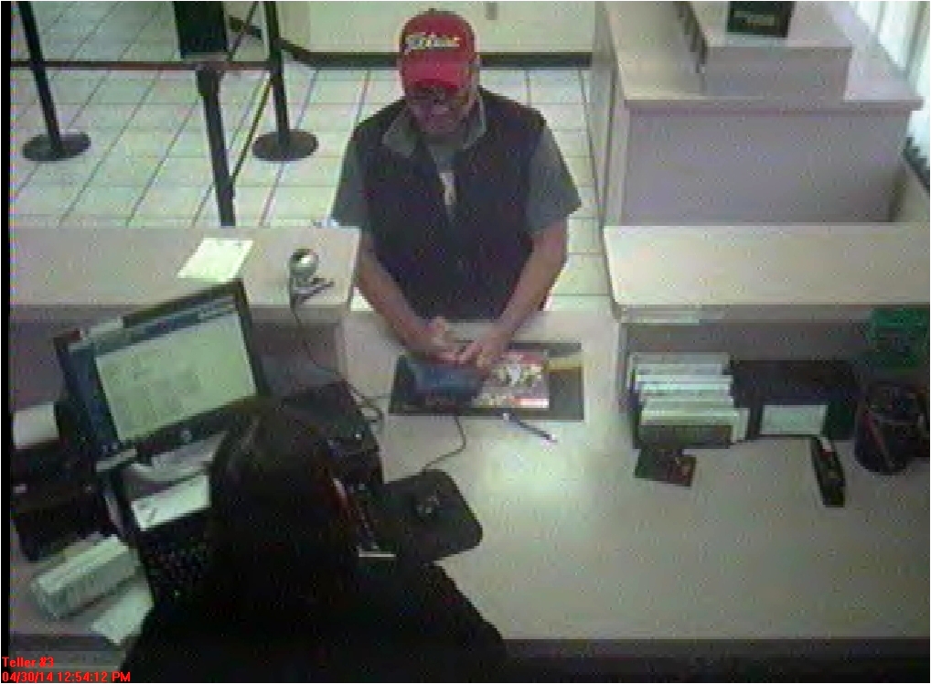Upon the officers arrival they were told that an unshaven white male wearing glasses with graying hair had come into the bank and given the teller a note telling her that he was armed and demanding she give him money. He was wearing a red ball cap with “Titleist” across the front, a gray or OD colored shirt under a dark colored vest. The letter X could be seen on the shirt through the opening in the vest, light colored jeans and dark tennis shoes. The suspect then fled the bank on foot in an unknown direction.