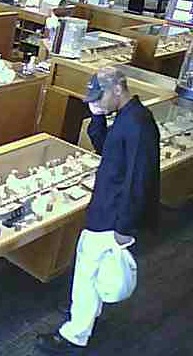 The employees inside the store advised the suspect entered the store and was talking on his cell phone while he was walking around the store. The employees advised the suspect started looking at the wedding rings and asked to see one set then another. At that point the suspect grabbed the ring and ran out the door. The manager gave chase and the employees called 911.