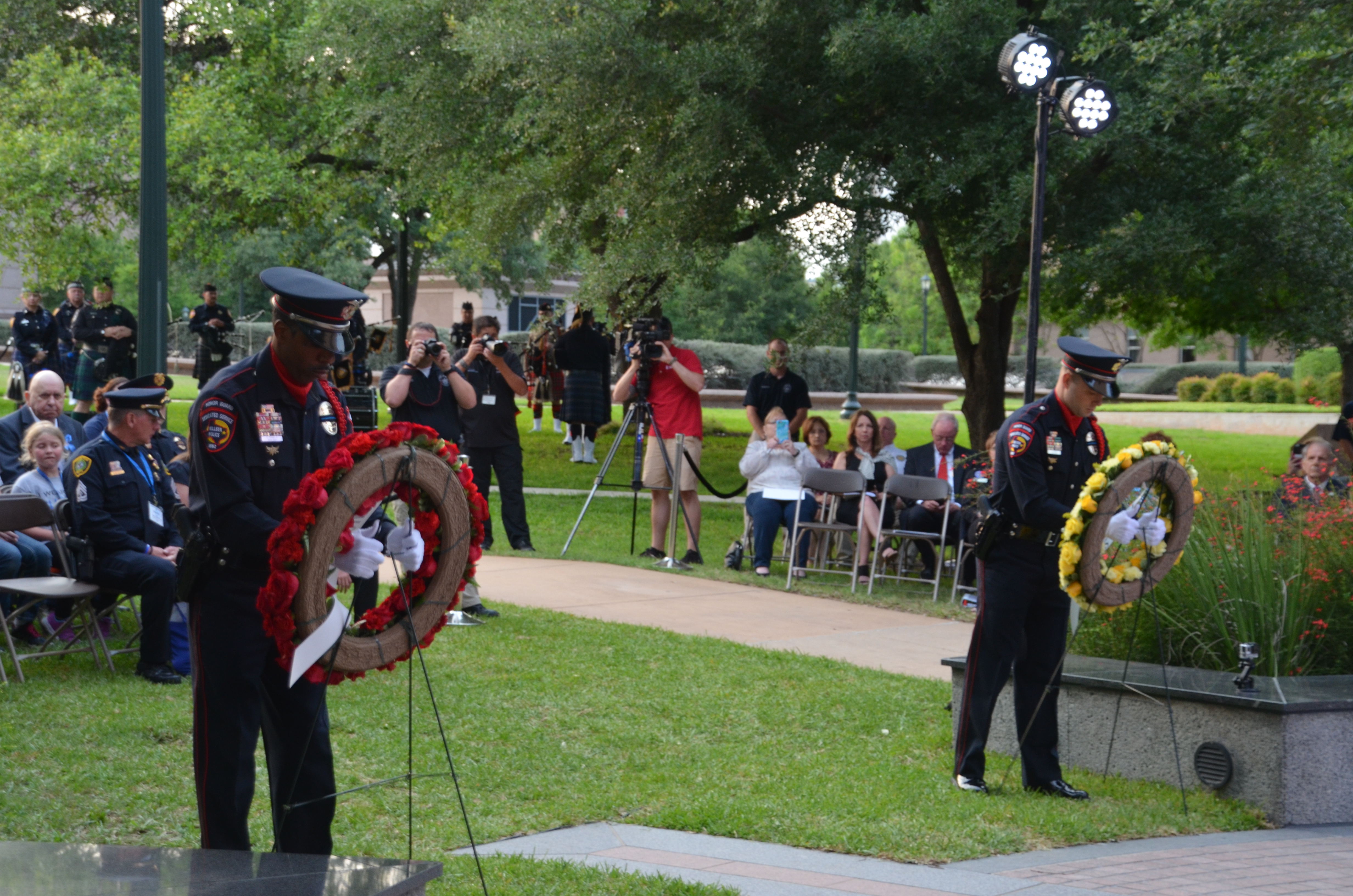 The Killeen Police Honor Guard had the privilege of placing the wreaths during the candlelight vigil and escorting the families of the slain officers families during the memorial service. It is always an honor to be asked to participate in these events, especially after losing two of our own officers. These officers who died in the line of duty may be gone but are never forgotten, they paid the ultimate sacrifice.