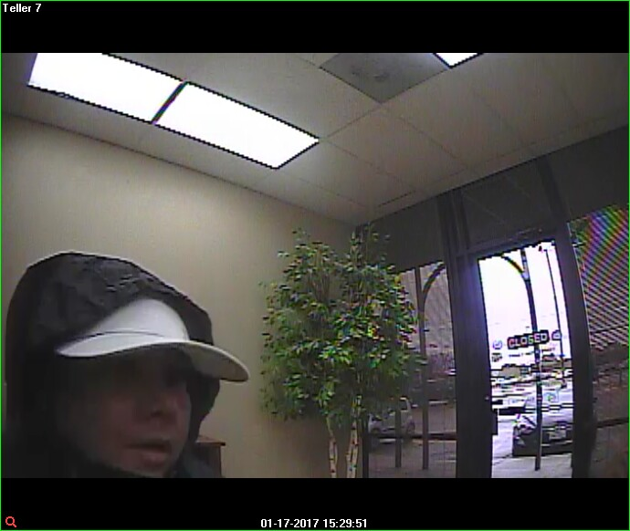 Officers responded to 2201 Trimmier Rd. on Tuesday, January 17, 2017, at 3:31pm, after receiving a 911 call letting them know the 1st National Bank had just been robbed. Officers were advised a short, heavyset, white or light skinned Hispanic female, entered the bank and gave the teller a note that demanded money. The suspect made reference to a weapon however, she did not display one. She then fled on foot from the bank with an undisclosed amount of money. The suspect was wearing a white low profile Starter cap, a black hooded jacket with a white stripe across the chest area and blue jeans.