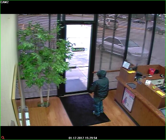 The suspect is described as a black male, approximately 6’ tall, wearing a dark hooded jacket, dark pants, black and red shoes and sunglasses.