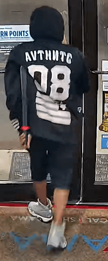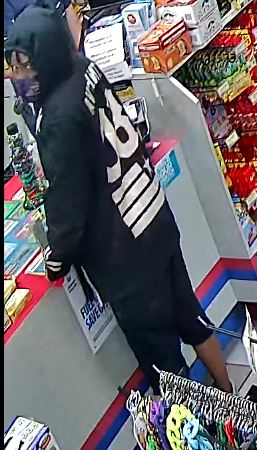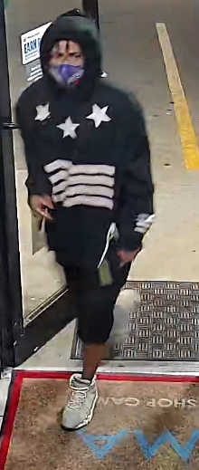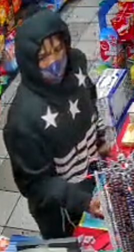 The victim described the suspect as a black male, approximately 25 to 30 years old with a skinny build. The suspect had longer hair sticking out of his hood and a purple facemask. He was wearing a black hooded sweatshirt with white stars and stripes on the front and the number 08 with stripes on the back. The suspect was wearing dark shorts and white shoes.