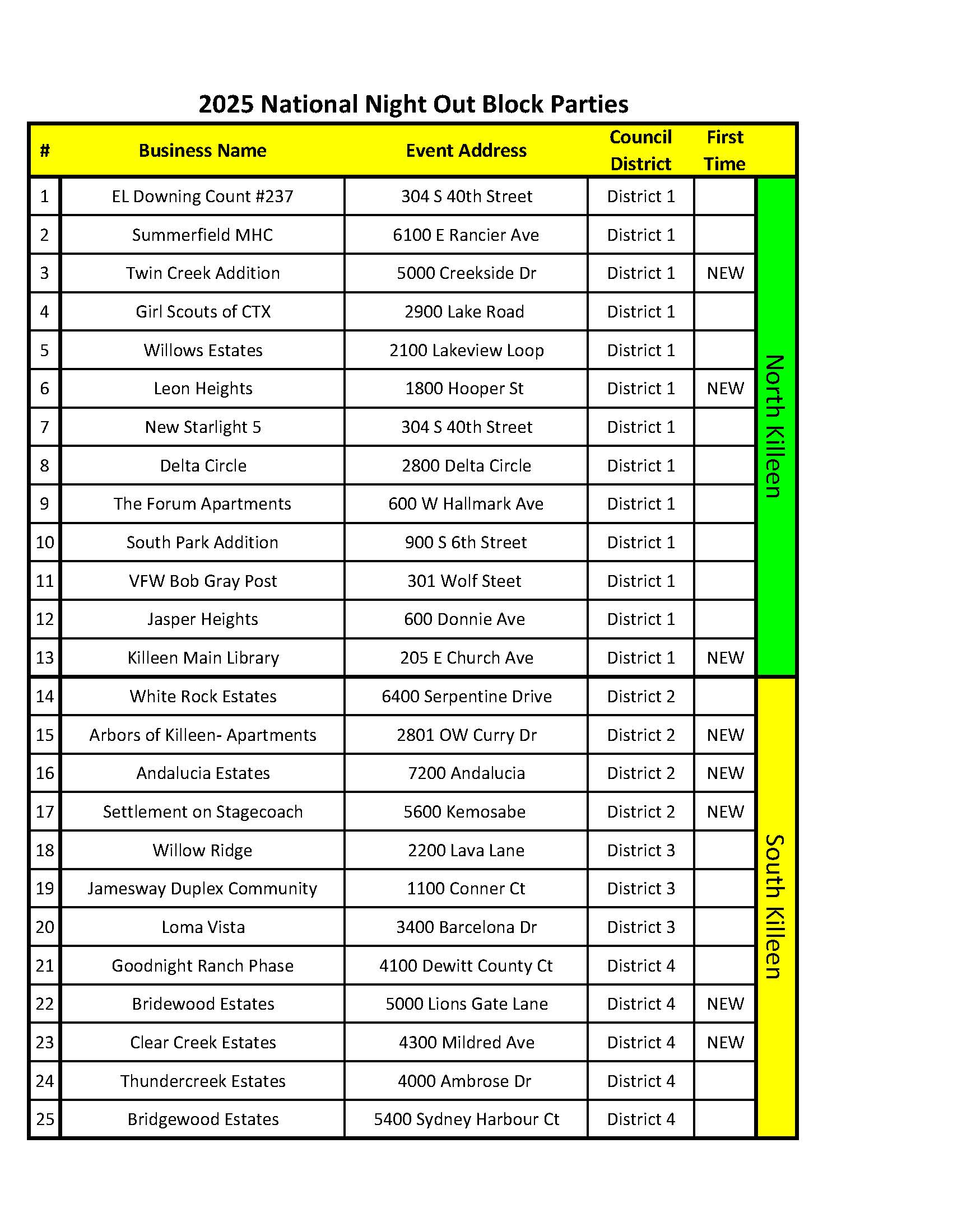 This year, we are excited to announce that Killeen will host 25 neighborhood block parties across the city—showcasing the strong partnerships between our residents and first responders. See the attached list and map below for all participating locations.