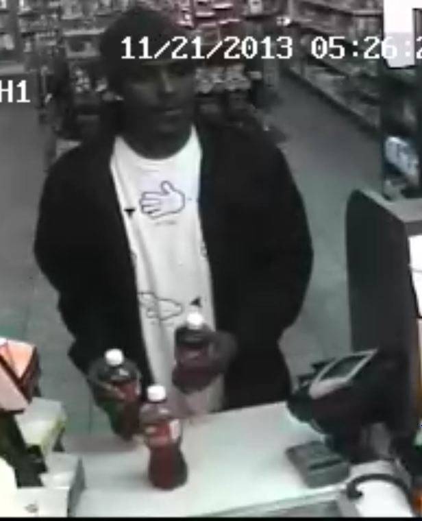 Officers were called to the 1900 block of Moonlight St., at 7:04 a.m. on November 21, 2013, in reference to a burglary of a vehicle. The victim realized that she left her purse inside her vehicle and when she went outside to get it, she noticed it was no longer there. She told officers that she called to cancel her credit card and was informed it had been used earlier that morning at two different locations near her residence. Officers obtained this photo from one of the store video surveillance cameras showing a black male wearing a dark jacket, dark colored beanie cap, a white tee shirt with hands on the front and jeans using the credit card.